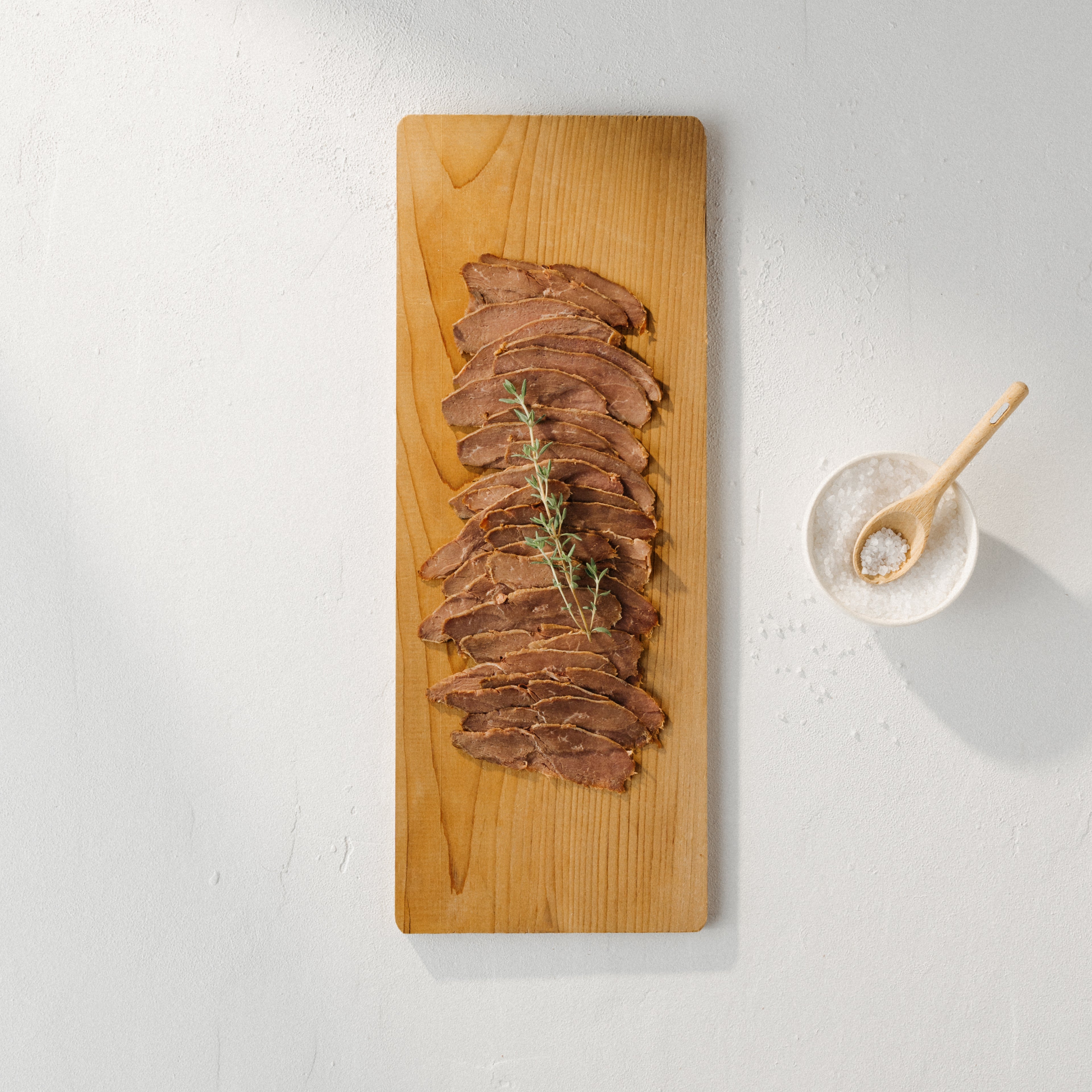 Notre poitrine d'oie tranchée fumée au bois d'érable ou avec les épices smoked meat.